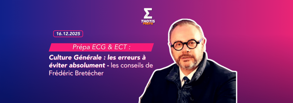 Frédéric Bretécher, professeur de culture générale en prépa ECG et à Audencia, et concepteur de sujets revient pour Thotis Prépa sur les erreurs majeures à éviter en Prépa ECG et ECT en culture générale. Il livre une analyse précise des écueils méthodologiques les plus fréquents chez les candidats, aussi bien dans le travail de fond en prépa que lors des épreuves de culture générale des concours Prépa menant aux grandes écoles de management.