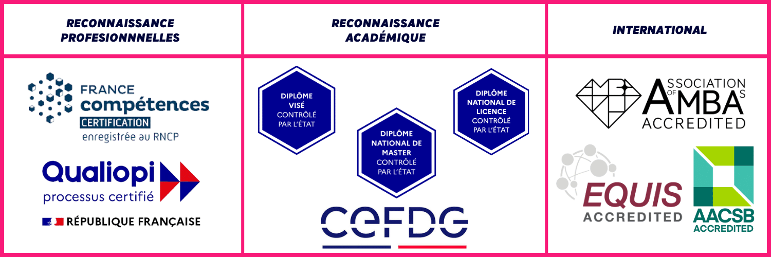 Ces derniers sont au nombre de quatre dont trois étrangers : les labels EQUIS et AMBA qui accréditent des écoles, le label AACSB qui certifie des programmes et enfin la CEFDG, signe de reconnaissance du gouvernement français.
